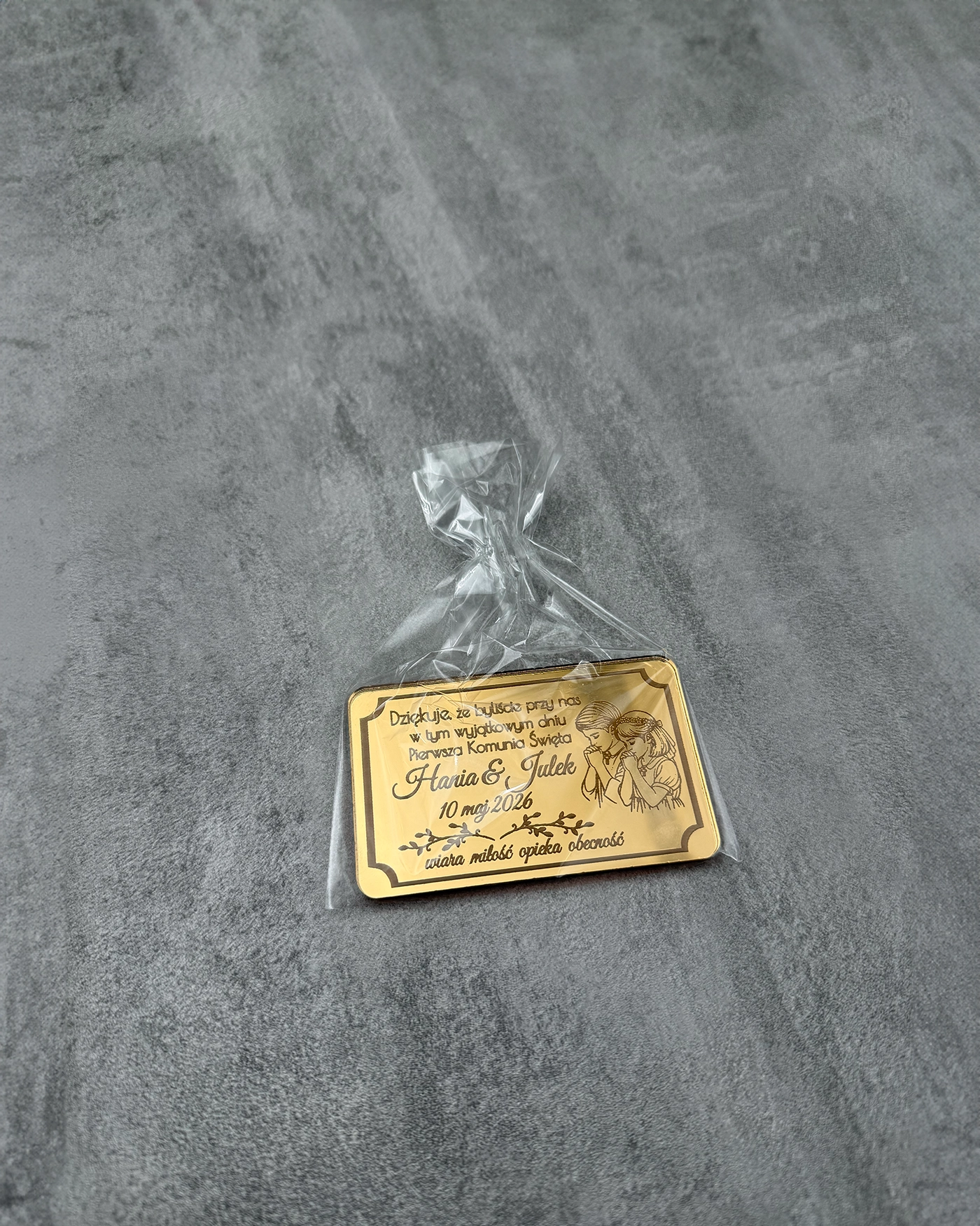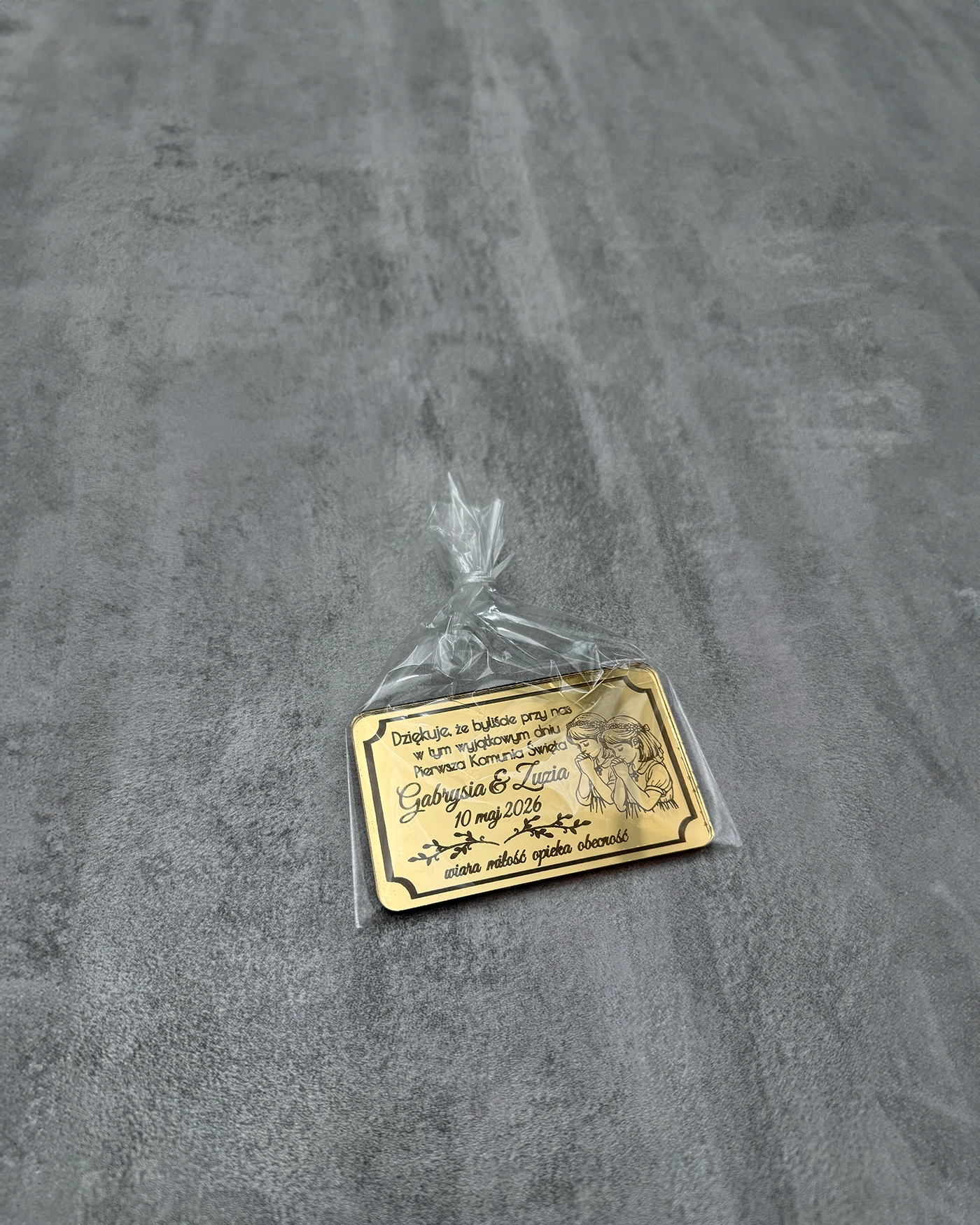 Podziękowanie dla gości z okazji Pierwszej Komunii Świętej bliźniąt wymaga szczególnej oprawy. Nasze magnesy z pleksi to elegancka, trwała i spersonalizowana pamiątka, która pomieści imiona obojga dzieci, zachowując przy tym pełną czytelność i klasę.