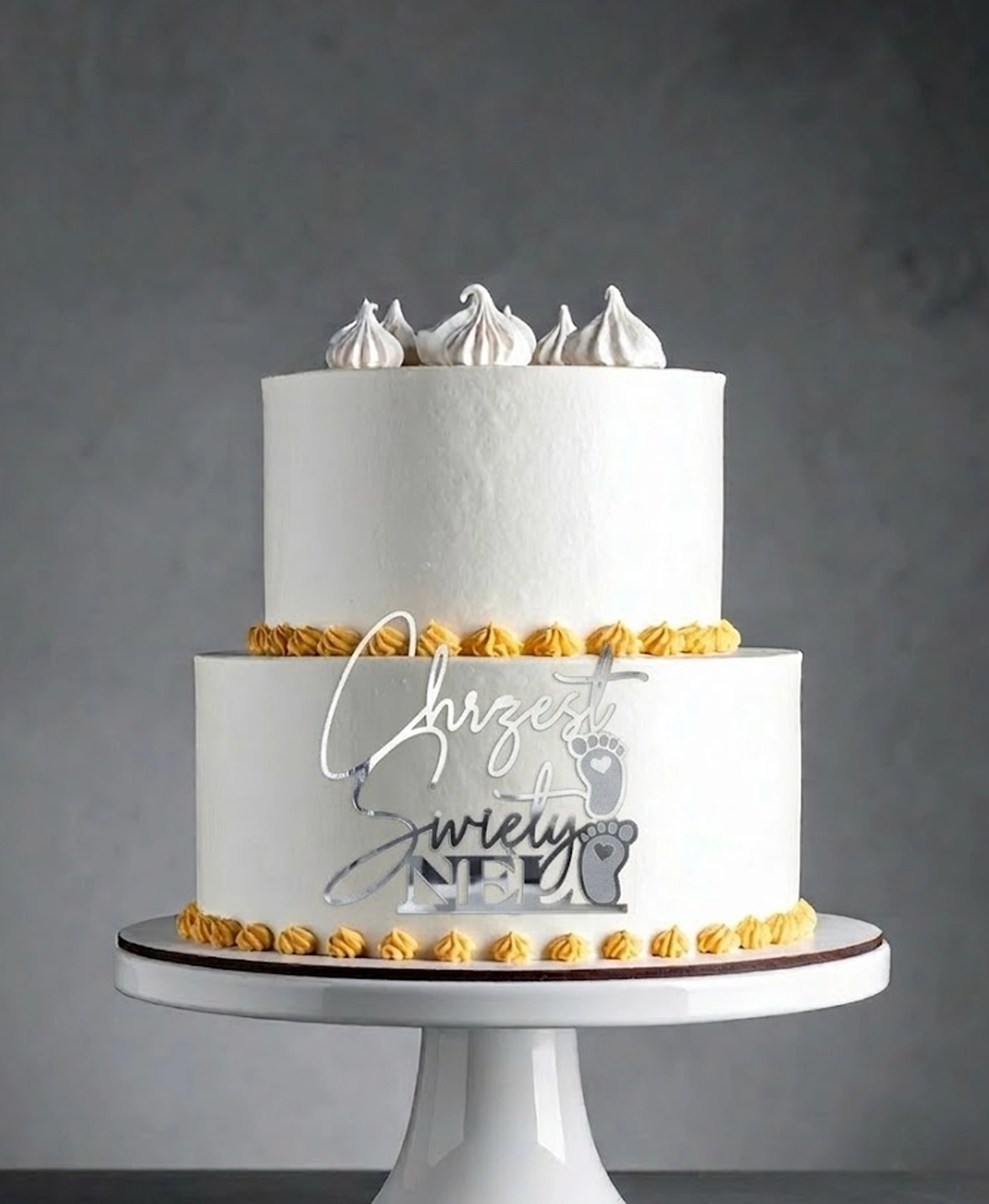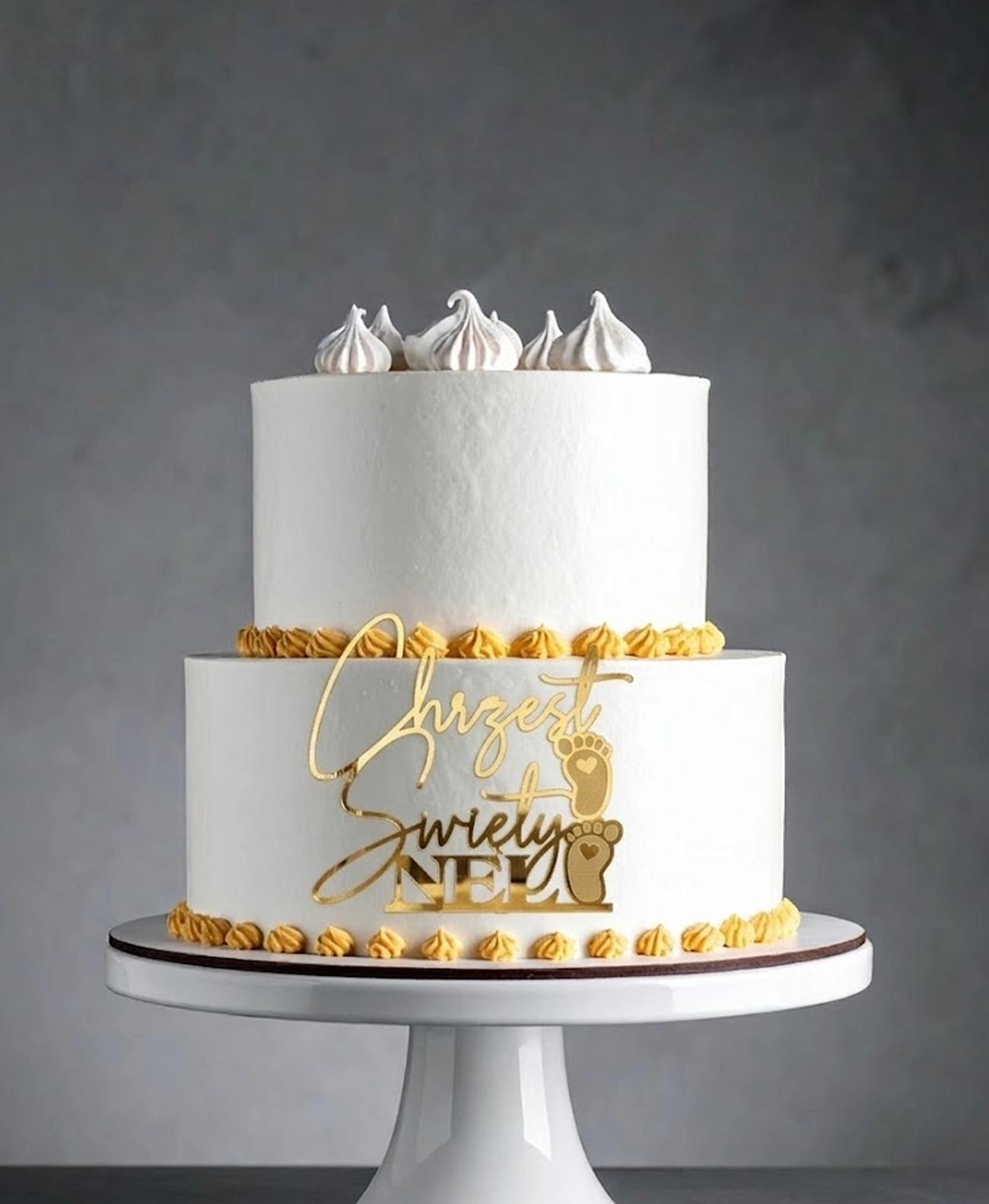 Topper Przoder na tort Chrzest Święty z imieniem to elegancka i personalizowana dekoracja tortu, która podkreśla wyjątkowy charakter uroczystości. Stopki są grawerowane. Dostępny w różnych wariantach kolorystycznych i materiałowych, pozwala na dopasowanie do indywidualnych preferencji.
