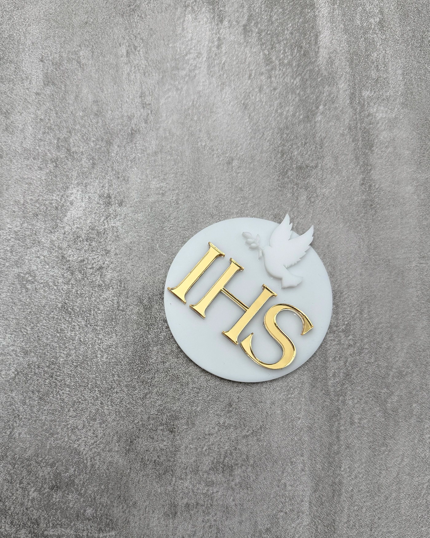 Warianty do wyboru: Dekoracja dostępna w wersji minimalistycznej (sam symbol IHS) lub wzbogaconej o subtelny motyw gołębicy.